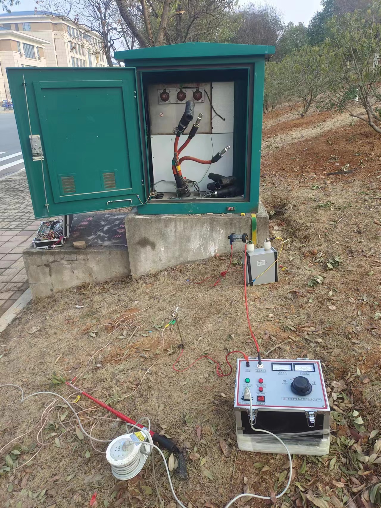 2020年12月30日收到江西省德安縣客戶的請(qǐng)求,說買了我們的電纜故障測(cè)試儀不會(huì)使用,于是聯(lián)系到我們公司,我們雷科電力有限公司收到客戶售后的請(qǐng)求后,馬上派出我們公司的技術(shù)總工出發(fā)前往客戶指定的地點(diǎn),到現(xiàn)場(chǎng)后跟客戶了解到這是一條10KV的電纜,長度不到兩公里。首先教客戶使用絕緣搖表測(cè)一下絕緣阻值,得出BC項(xiàng)的阻值偏低。給這條電纜做了個(gè)耐壓后,使用電纜故障測(cè)距儀脈沖法測(cè)出電纜故障點(diǎn)的位置在332米,隨后使用一套工頻耐壓試驗(yàn)裝置配個(gè)電容和球隙對(duì)這條電纜的BC項(xiàng)進(jìn)行放電,使用聽筒去測(cè)距儀測(cè)的位置附近去聽,果然聽到了放電"砰砰砰"的聲音挖出剖開搖下絕緣沒問題后,此次故障圓滿完成,客戶也說學(xué)到了許多。